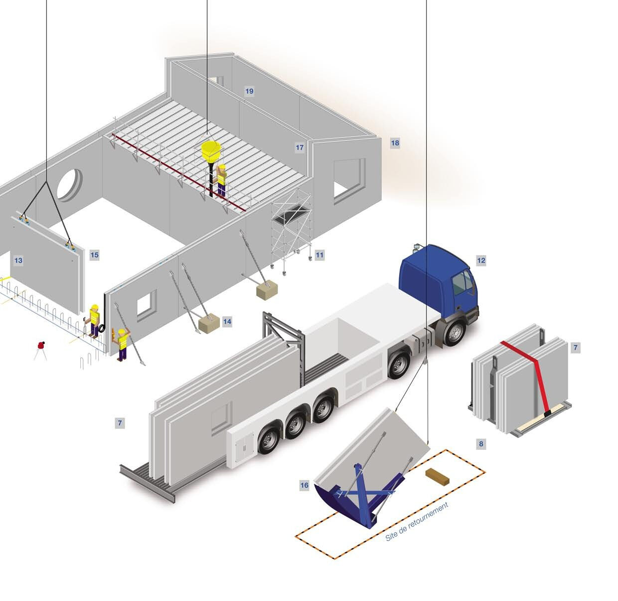 Toutes nos livraisons sont réalisées à la verticale ou sur chant sur rack ou box permettant le stockage sur chantier et une manipulation sécurisée en limitant les manipulation des Prémurs. Levage simplifié en 2 points. Éligible au levage déporté à hauteur d’homme.