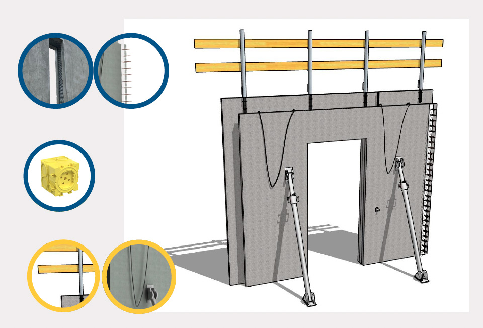 cet élément est rempli de béton sur chantier pour construire un mur monolithique solide et durable. Les murs double peau peuvent être associés à des éléments structurels préfabriqués ou coulés sur place tels que poteaux, poutres, prédalles ou planchers, pour constituer une structure porteuse complète et homogène.